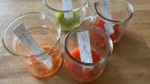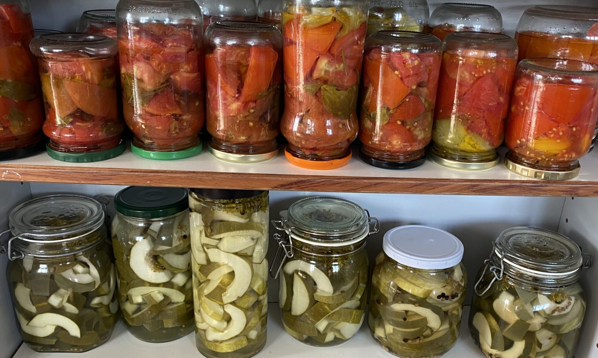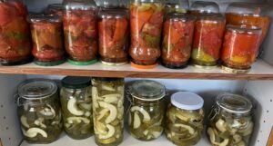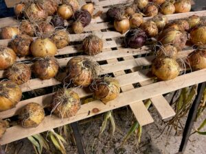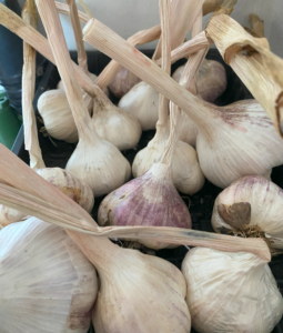 Haven har været gavmildt i år. Der er masser af lækre tomater og agurker i polytunnelen, som vi spiser, har henkogt og syltet. Løgene er ganske store, mens hvidløgene lidt mindre end de sidste år. Hidtil har vi brugt den franske sort Messidrome, men næste gang vil vi også prøve “Rød Estisk”, som måske passer lidt bedre til vore himmelstrøg.